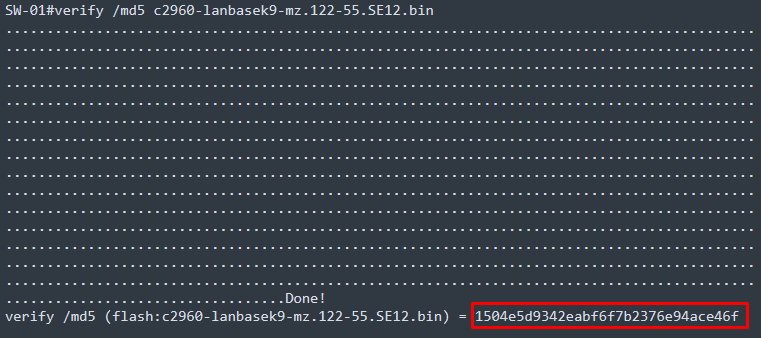 SW-01#verify /md5 c2960-lanbasek9-mz.122-55.SE12.bin